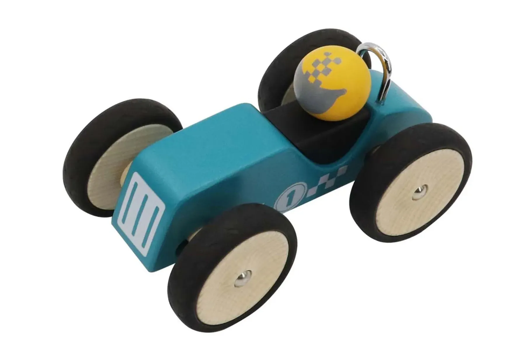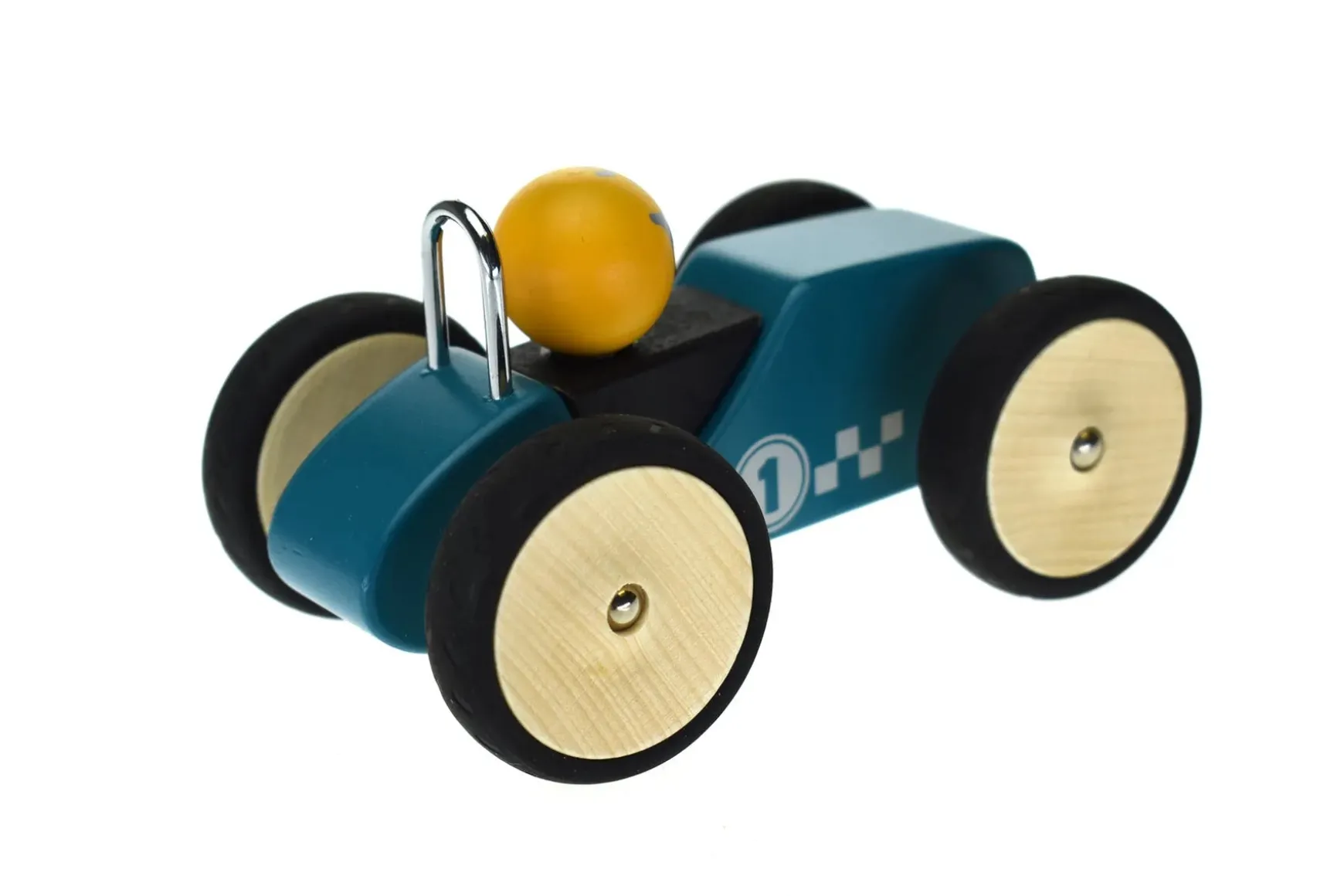 Large, retro styled, open-wheeler, wooden race car with helmeted driver and rubberised wheels. This guy means business – he’s out to win. Beautiful, yet sturdy enough to play with. Available in red or blue.