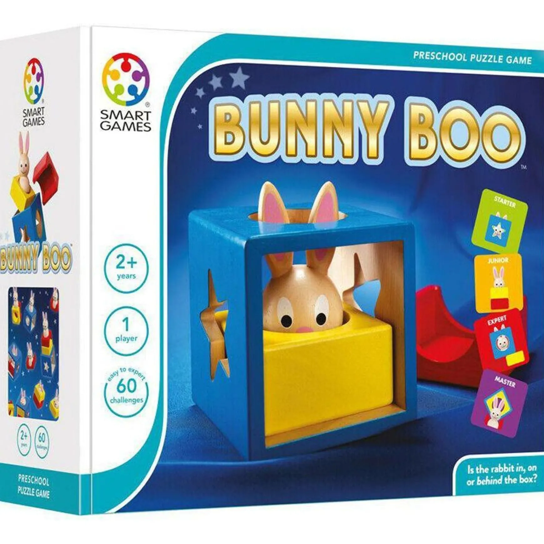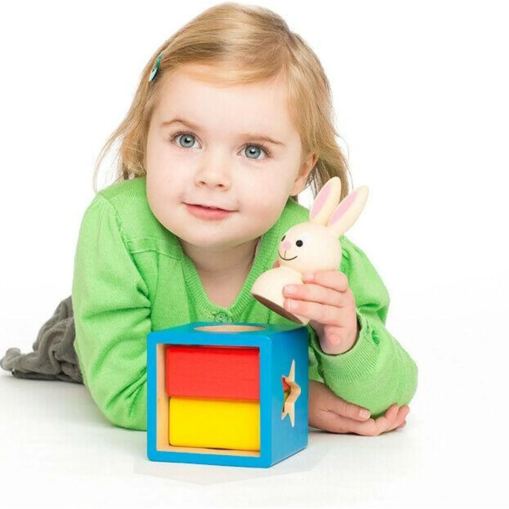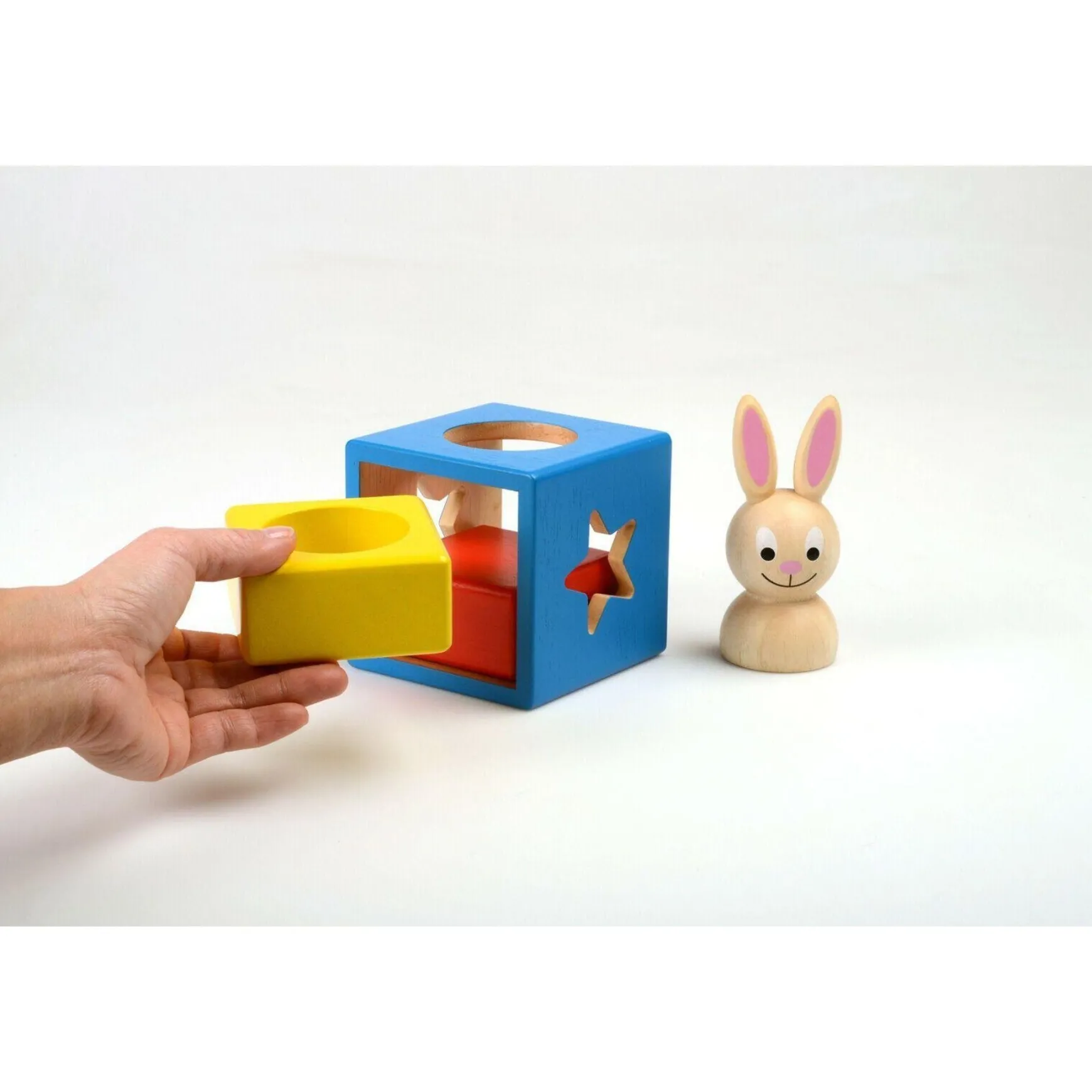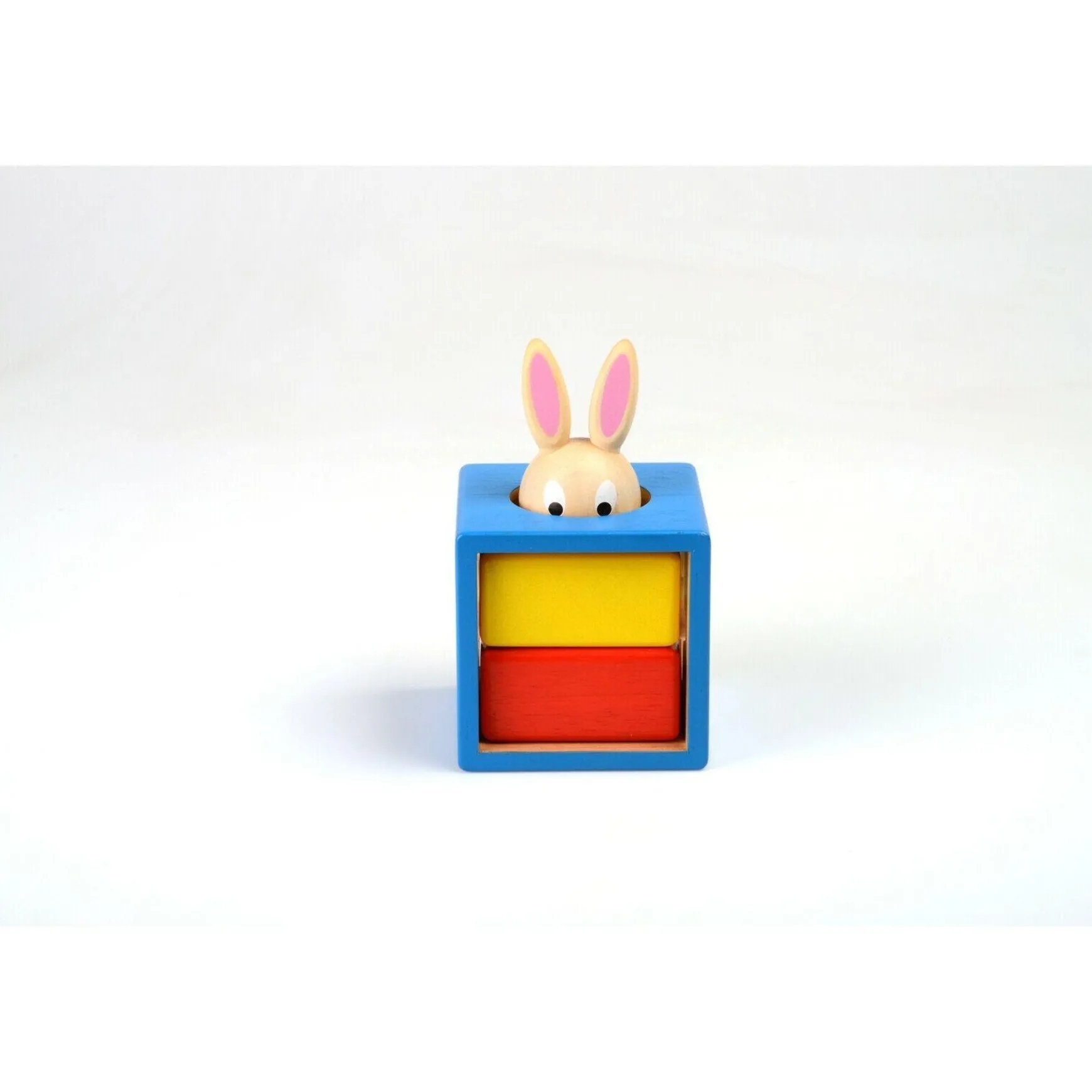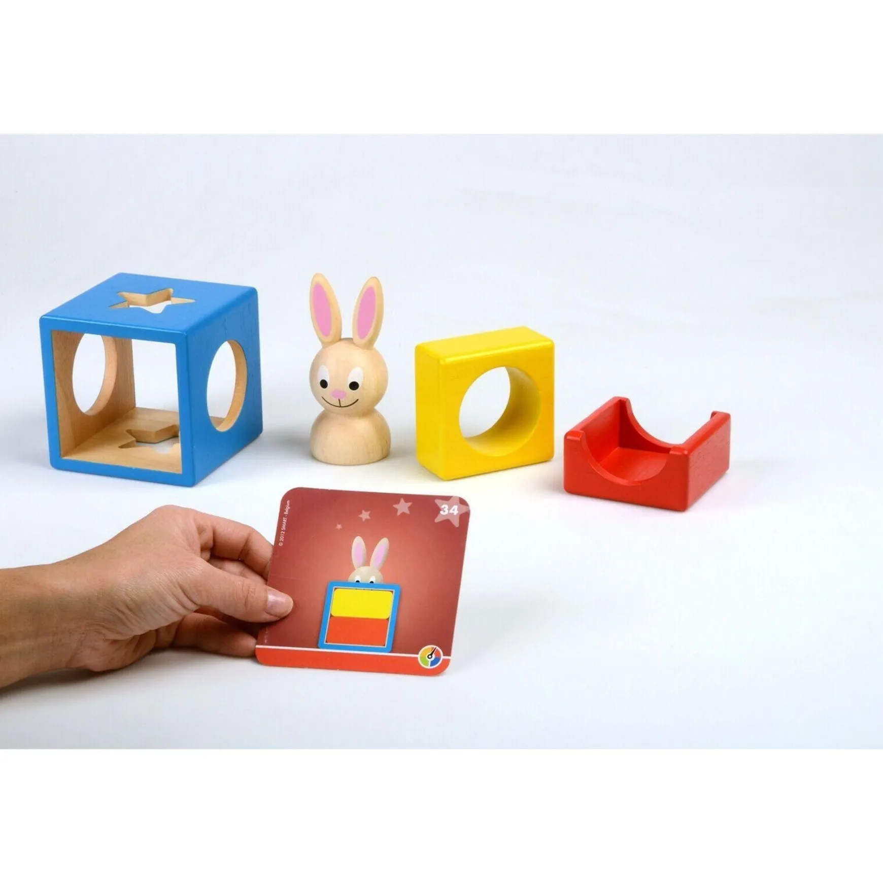 Pull a rabbit out of the box! Bunny Peek-a-Boo is a 3D puzzle for young children. It comes with four big, sturdy wooden blocks, and kids arrange the blocks to match each challenge. Some challenges may look very similar, but the solution can be completely different depending on things like how far the ears of the rabbit stick out. With Bunny Peek-a-Boo, children will have fun discovering the world of 3D spatial perception. Children can solve the 60 challenges or just play with the blocks as wooden toys.