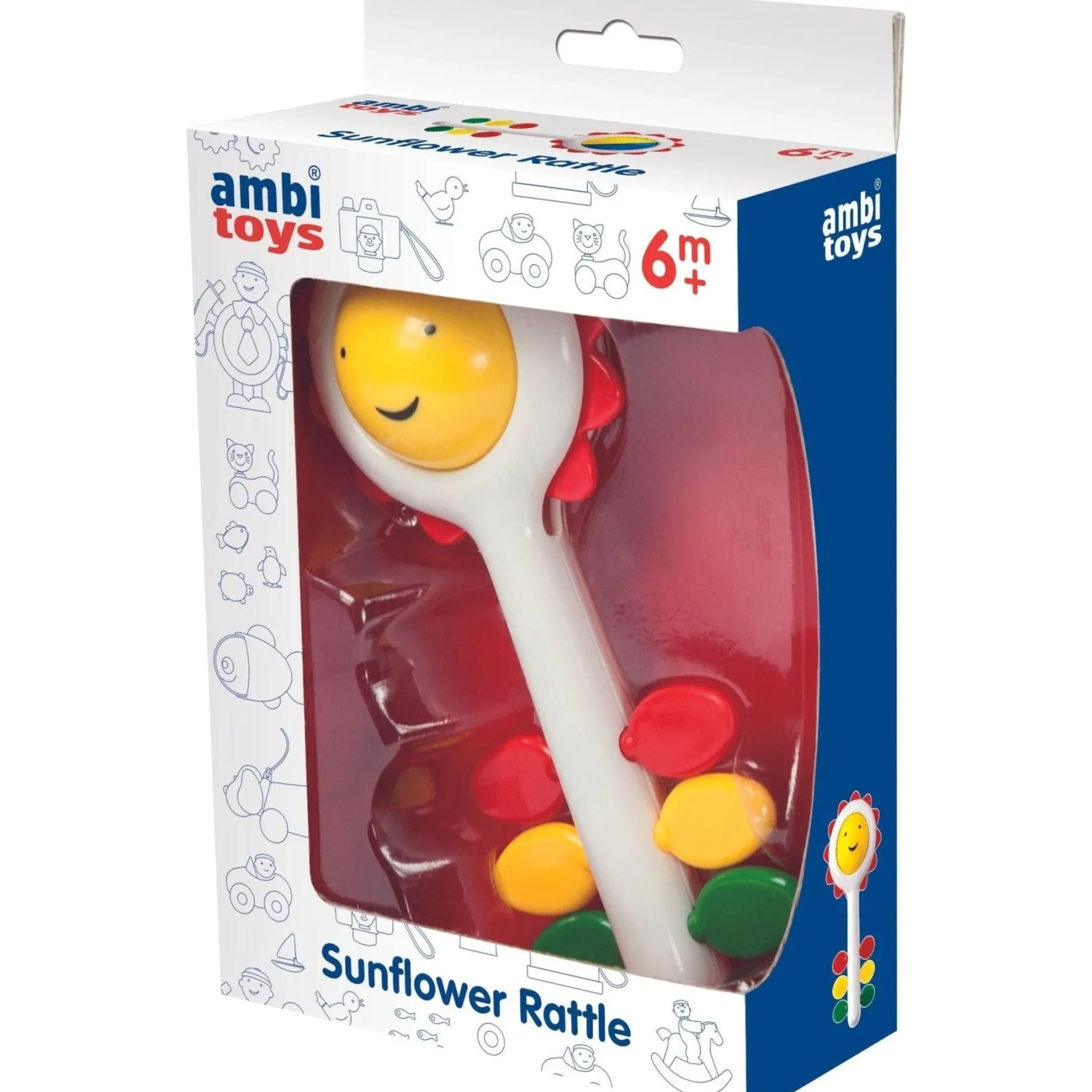 A cheery sunflower rattle to spin, shake, touch and turn. This 2-in-1 rattle can also be used as a teether.