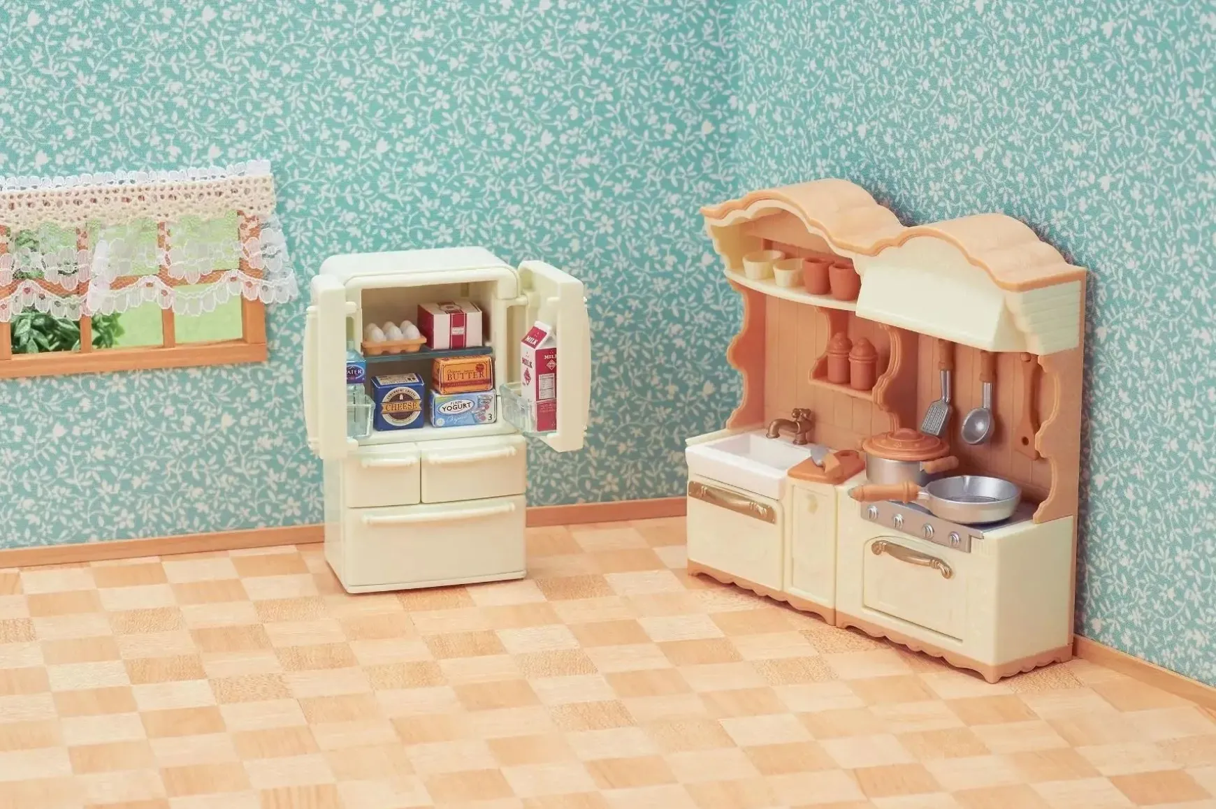 Includes: Sink Unit, Drawers, Food Storage Space, Cooker Unit, Frying Pan, Pot, Pot Lid, Cutting Board, Spatula, Ladle, Wooden Spatula, Kitchen Knife, 2 x Seasoning Containers, 2 x Seasoning Container Lids, 2 x Cups, 2 x Baking Dish, Refrigerator, 2 x Ice Cubes, Ice Scoop, Apple, Cucumber, Paprika, Plastic Bottle, Milk Carton, Eggs, 7 x Paper Packs (a total of 37 pieces).