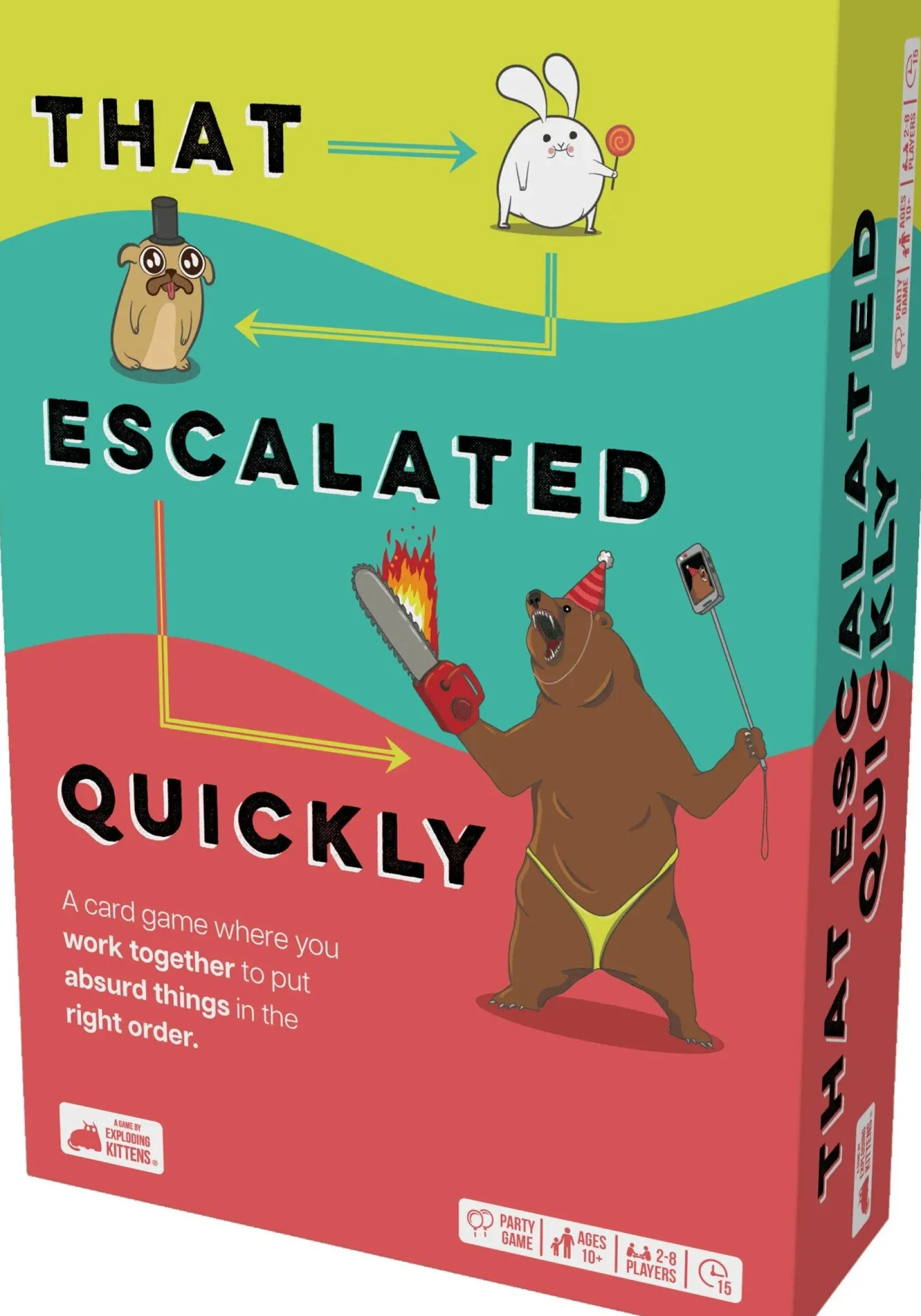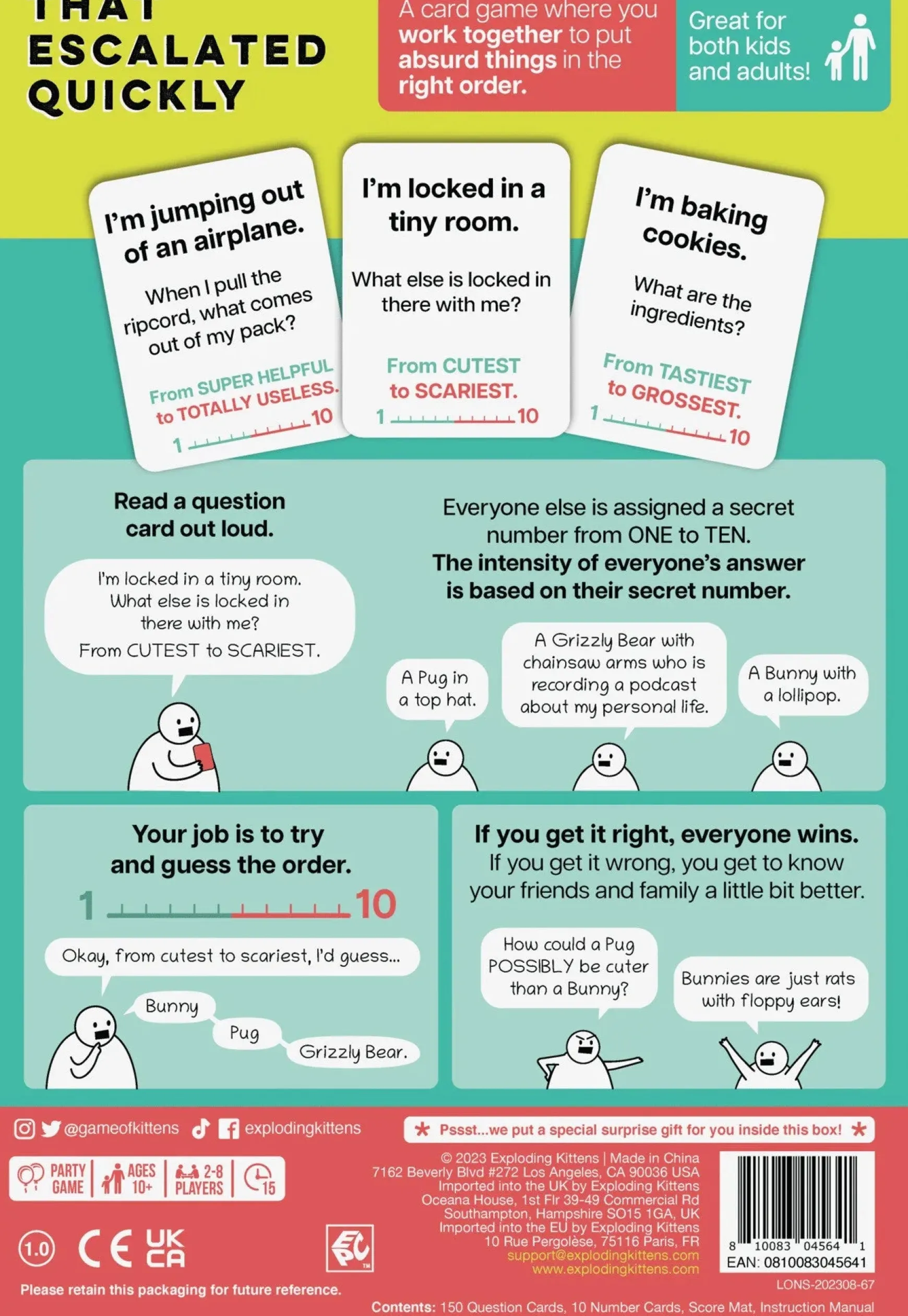 To play That Escalated Quickly, read out a simple question (ex. I’m locked in a tiny room. What else is locked in here with me from cutest to scariest).