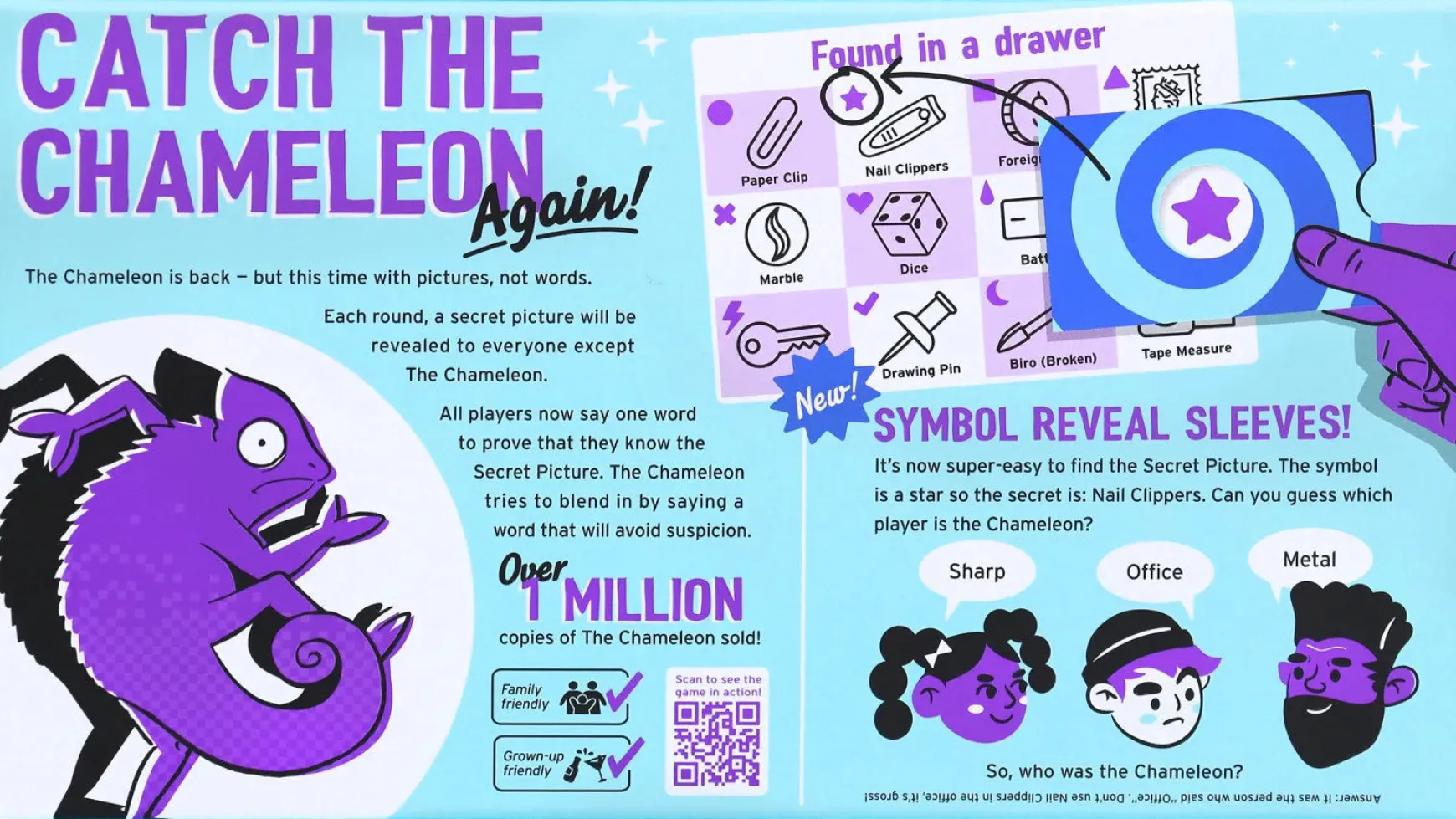 To catch them, each player will say one word related to the picture. The Chameleon cant see the secret picture so theyll have to blend in by saying something that makes them sound like they know what everyones talking about. Will the Chameleon escape yet again? Or will everyone manage to catch them out?