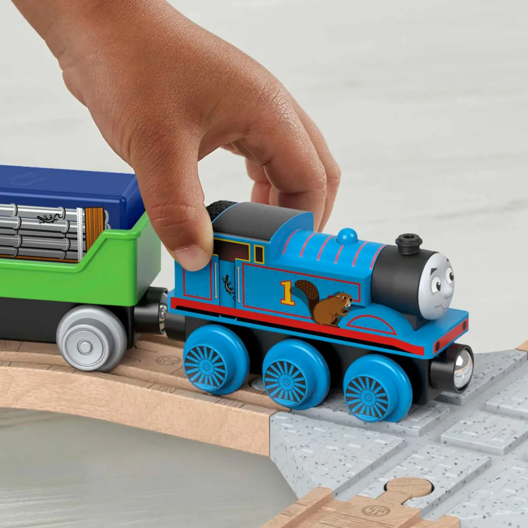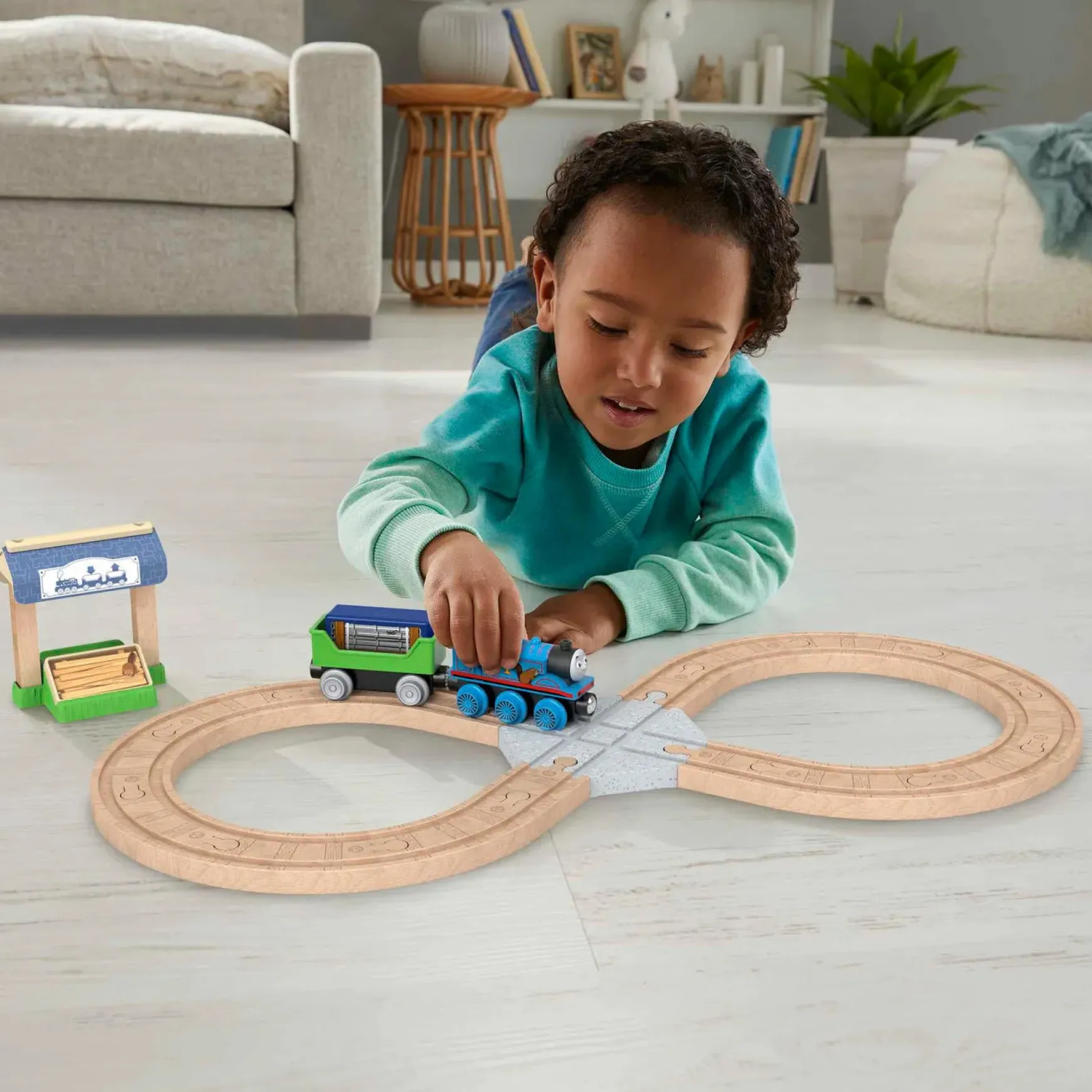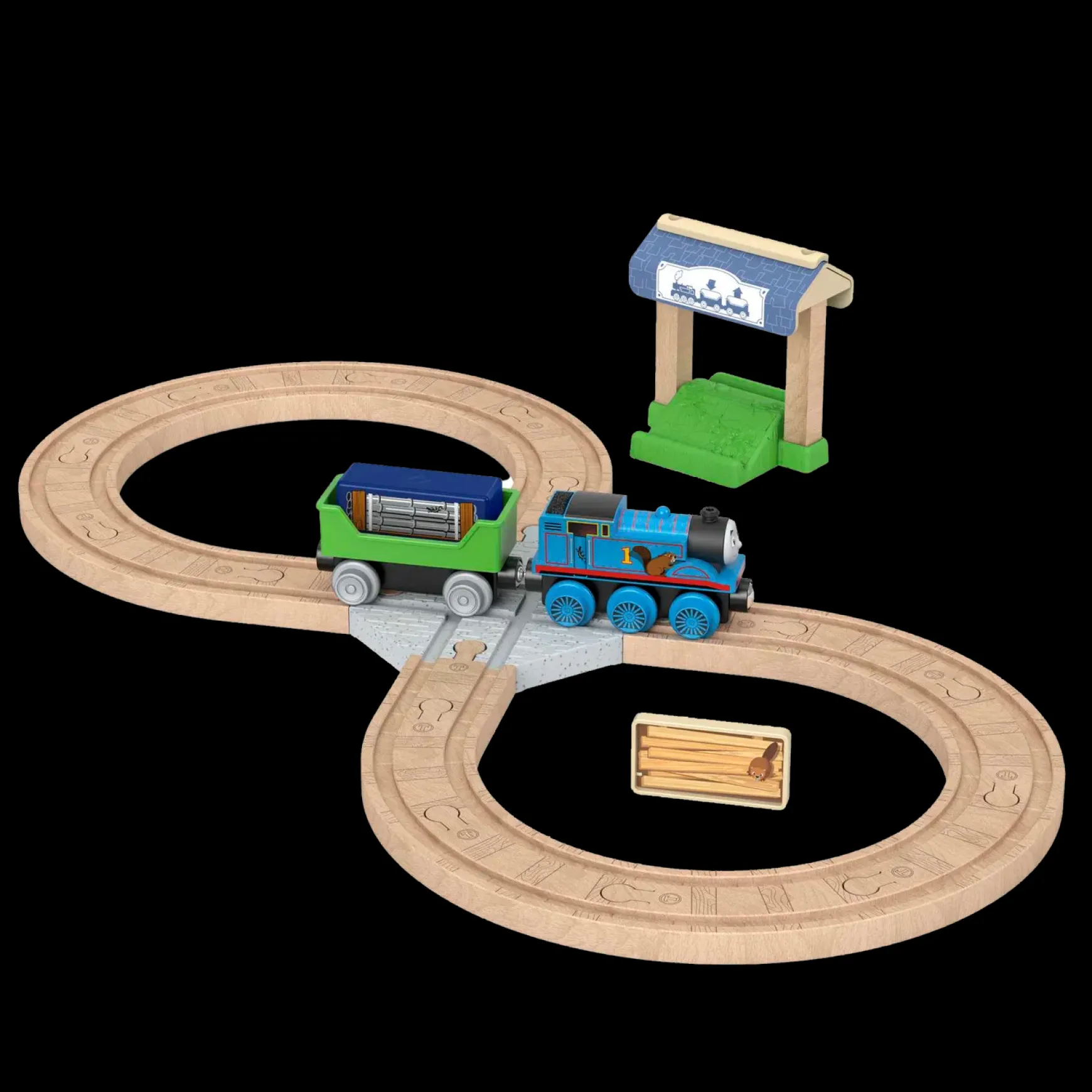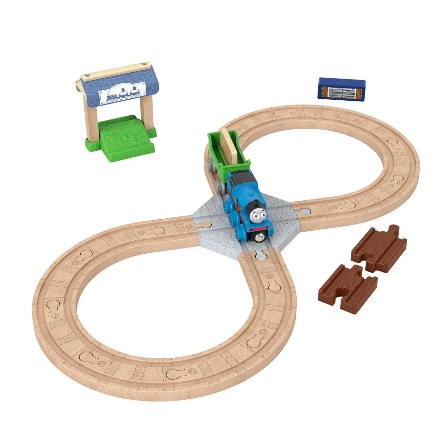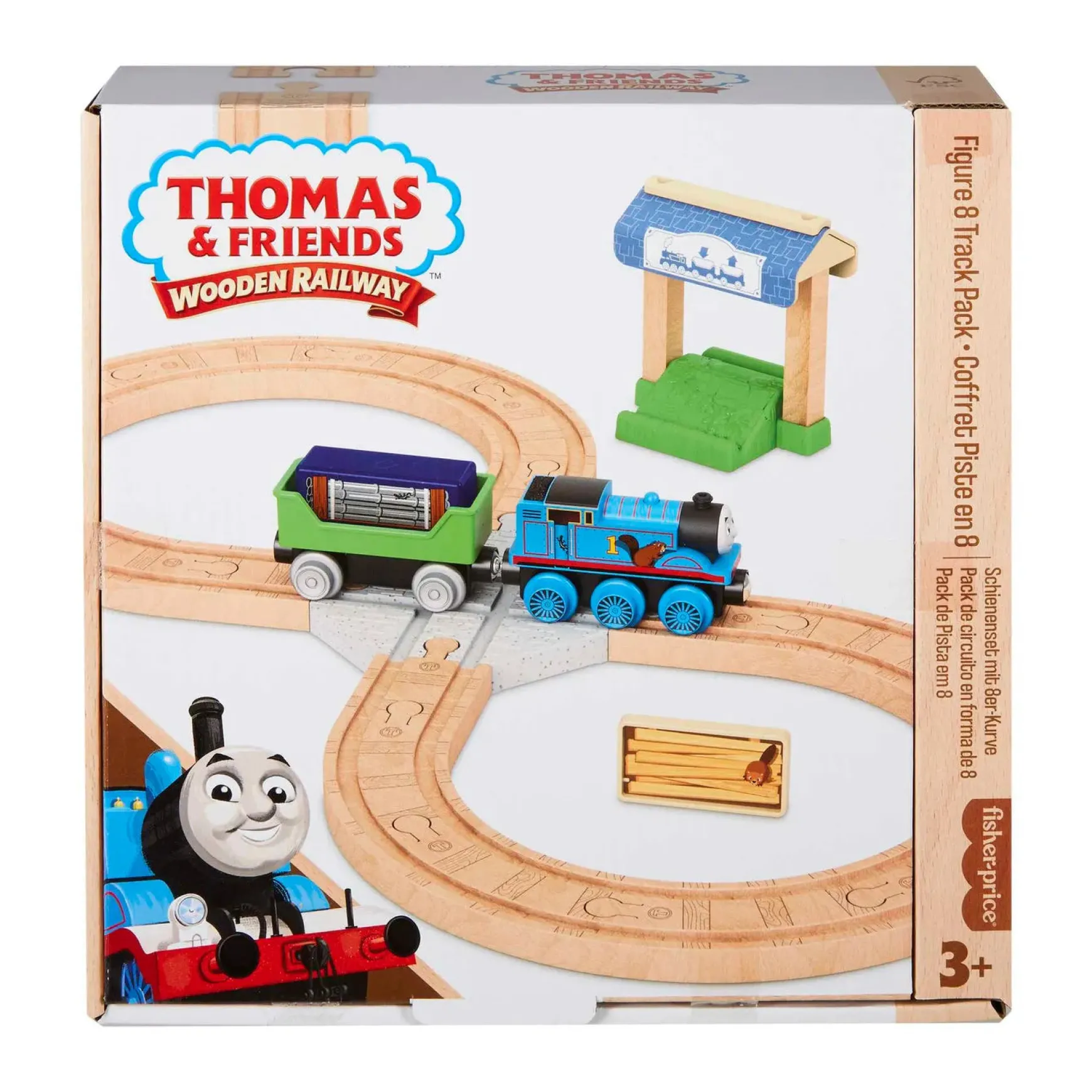 Preschool kids can create lots of railway fun with this Thomas u0026amp; Friends Wooden Railway Figure 8 Track Pack. This wood train set comes with the No.1 Blue Engine, Thomas, a cargo car, depot stand, cargo cube, tile play piece, and a full figure 8 loop of Clackety Track wood pieces. Easy to build but endlessly exciting, kids can connect this set to any Thomas u0026amp; friends Wooden Railway set with the 2 track adapters included. (Additional sets sold separately and subject to availability).