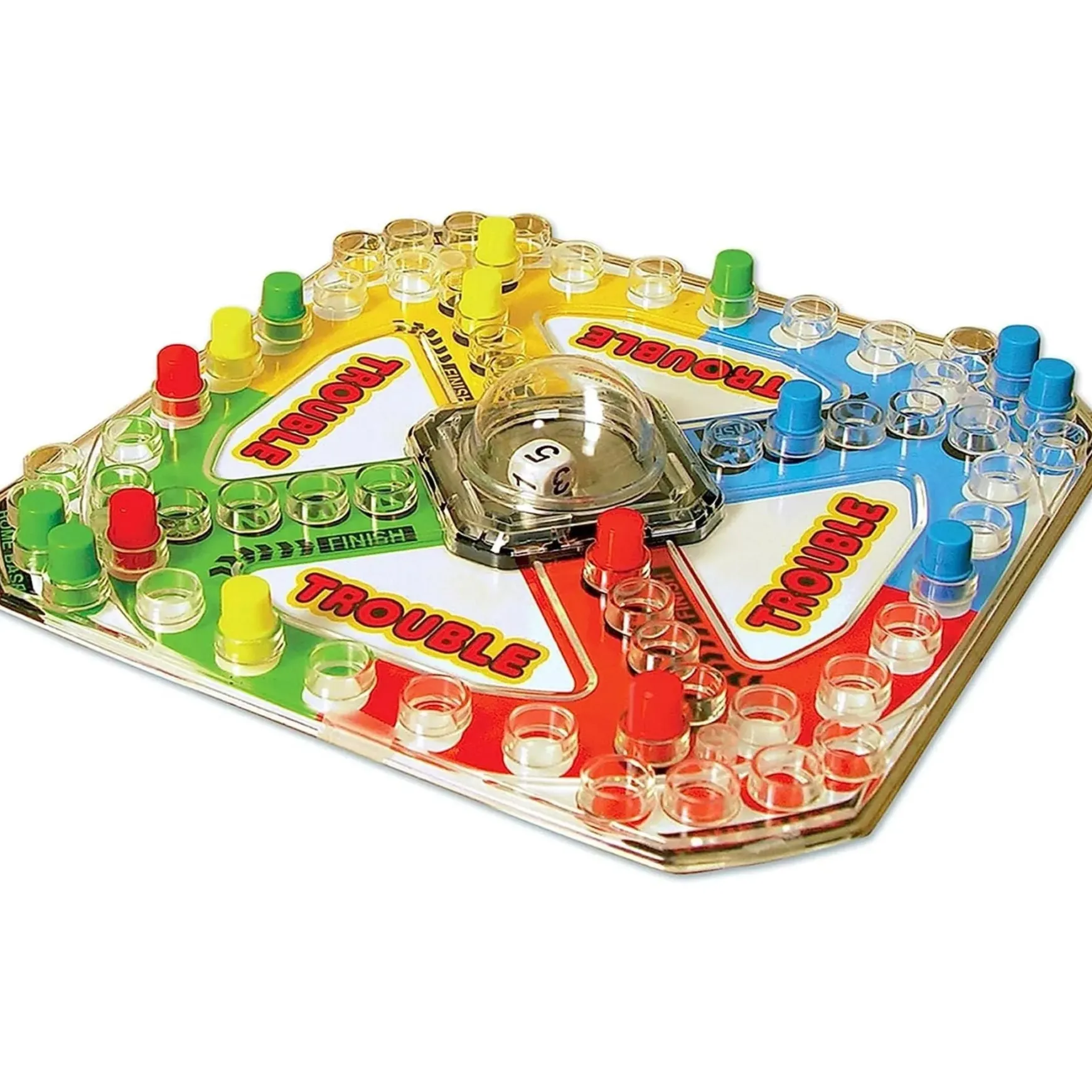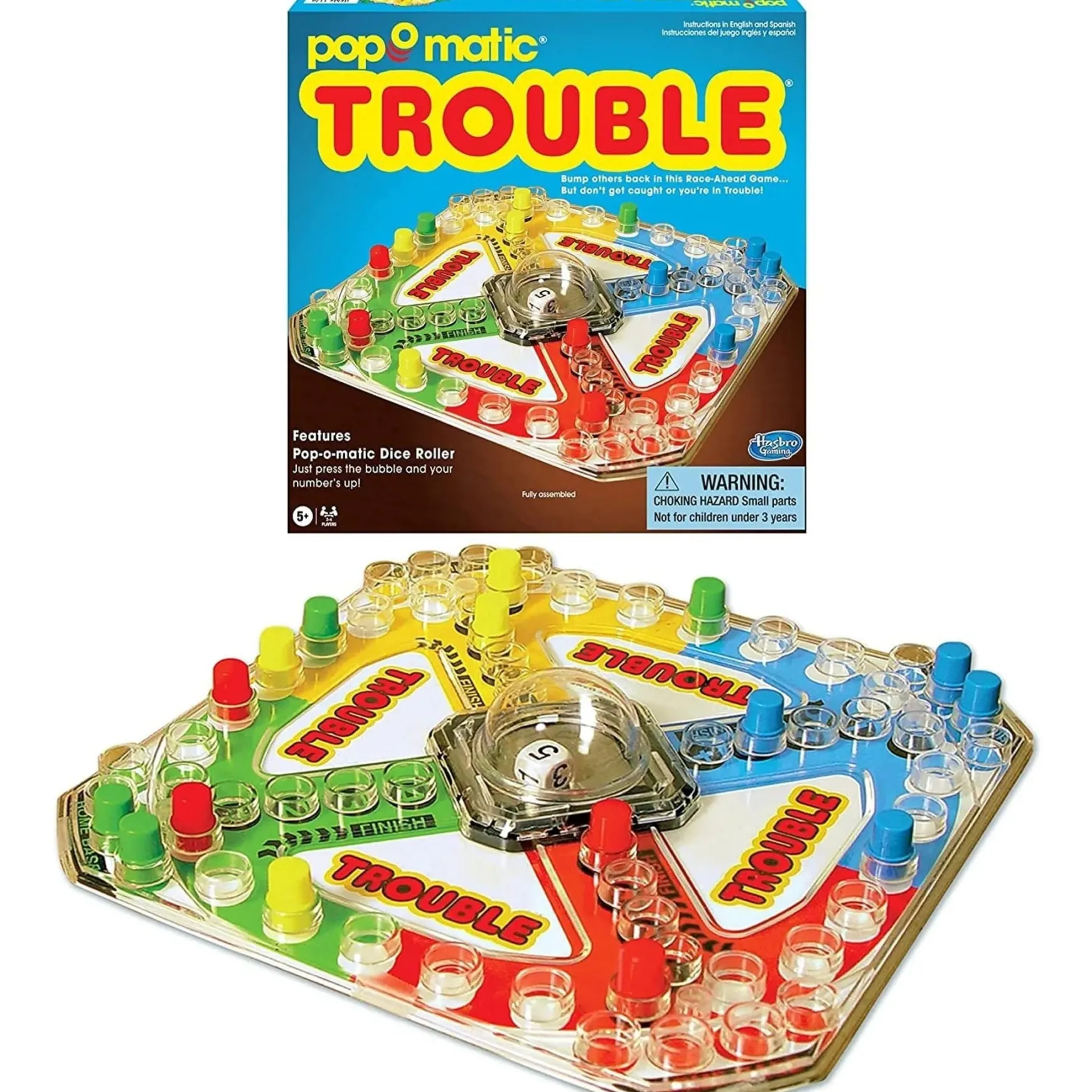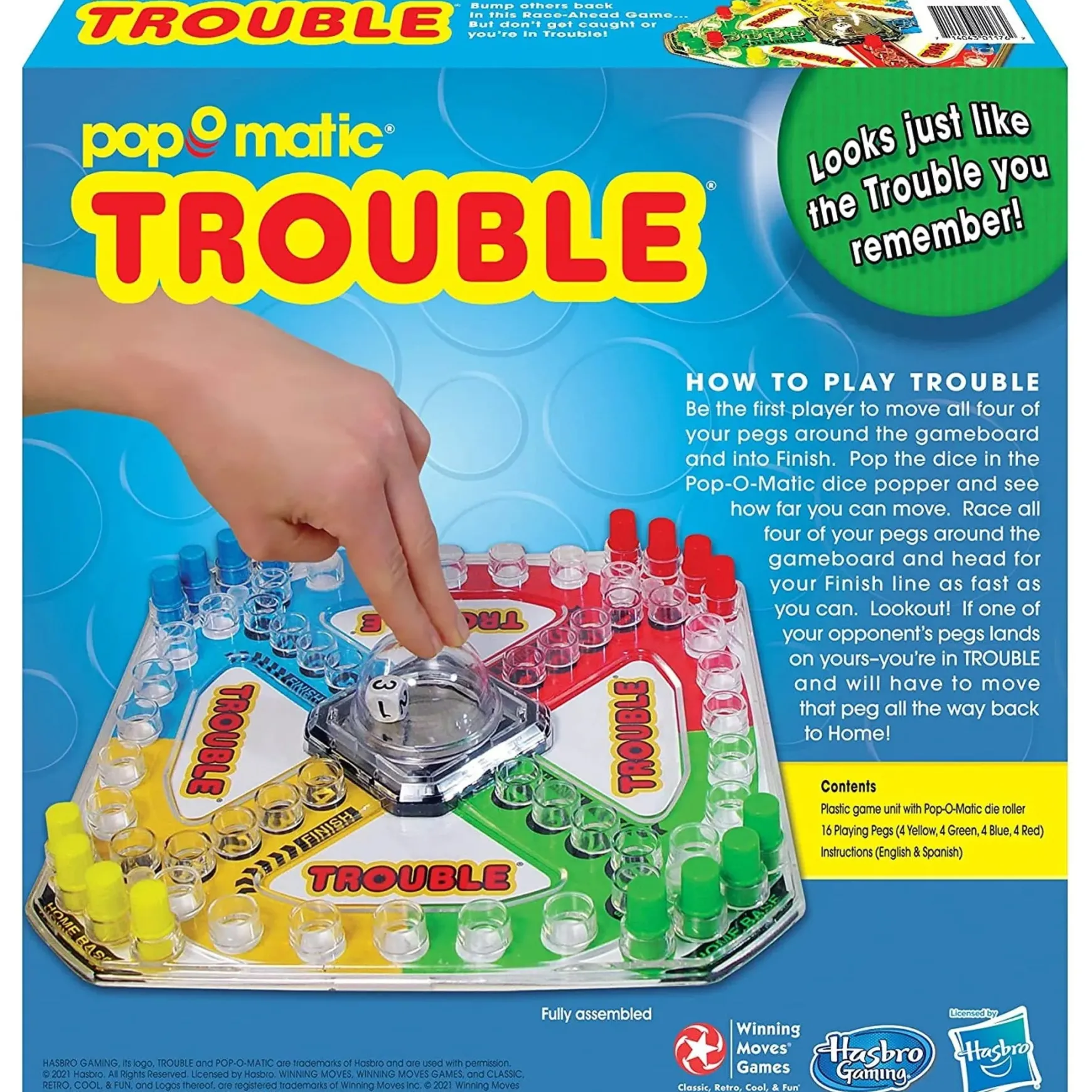 The Classic game of POP-O-MATIC Trouble as you remember it. Be the first player to move all four of your pegs around the game board into finish and you win. Includes plastic game board with pop-o-matic die roller, 16 playing pegs.