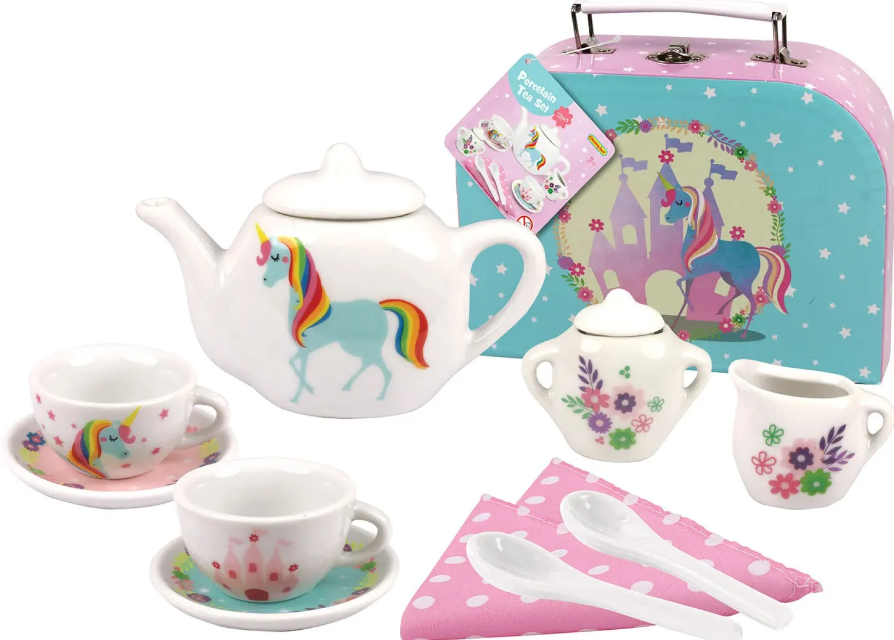 Miniature Unicorn Porcelain Tea Set 13pcs. A cute porcelain tea set comes in a beautifully made and designed strong cardboard suitcase. Each piece has a lovely print on. What a beautiful set to bring out for afternoon parties. Just like grandma and granddad bringing out the good China for afternoon tea. Role play gives opportunities to learn and develop. Ideal for playing with friends.