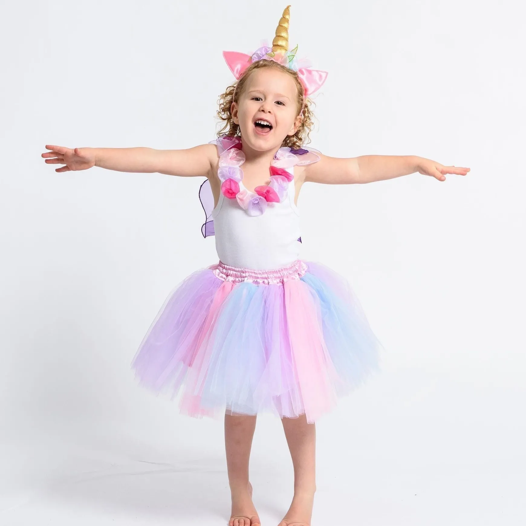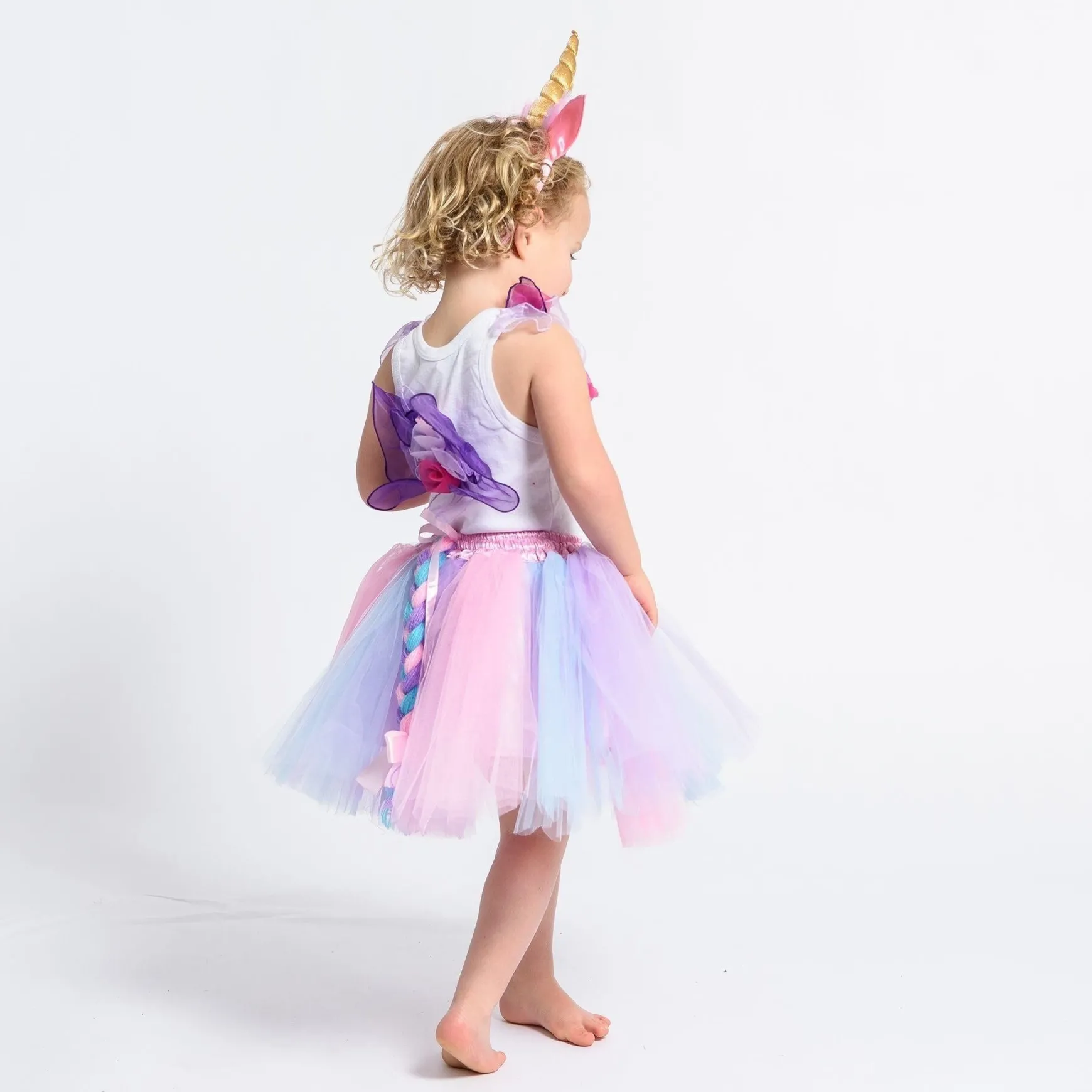 Our amazing Unicorn set comes with a pretty pastel skirt with a plaited tail and a matching unicorn headband.