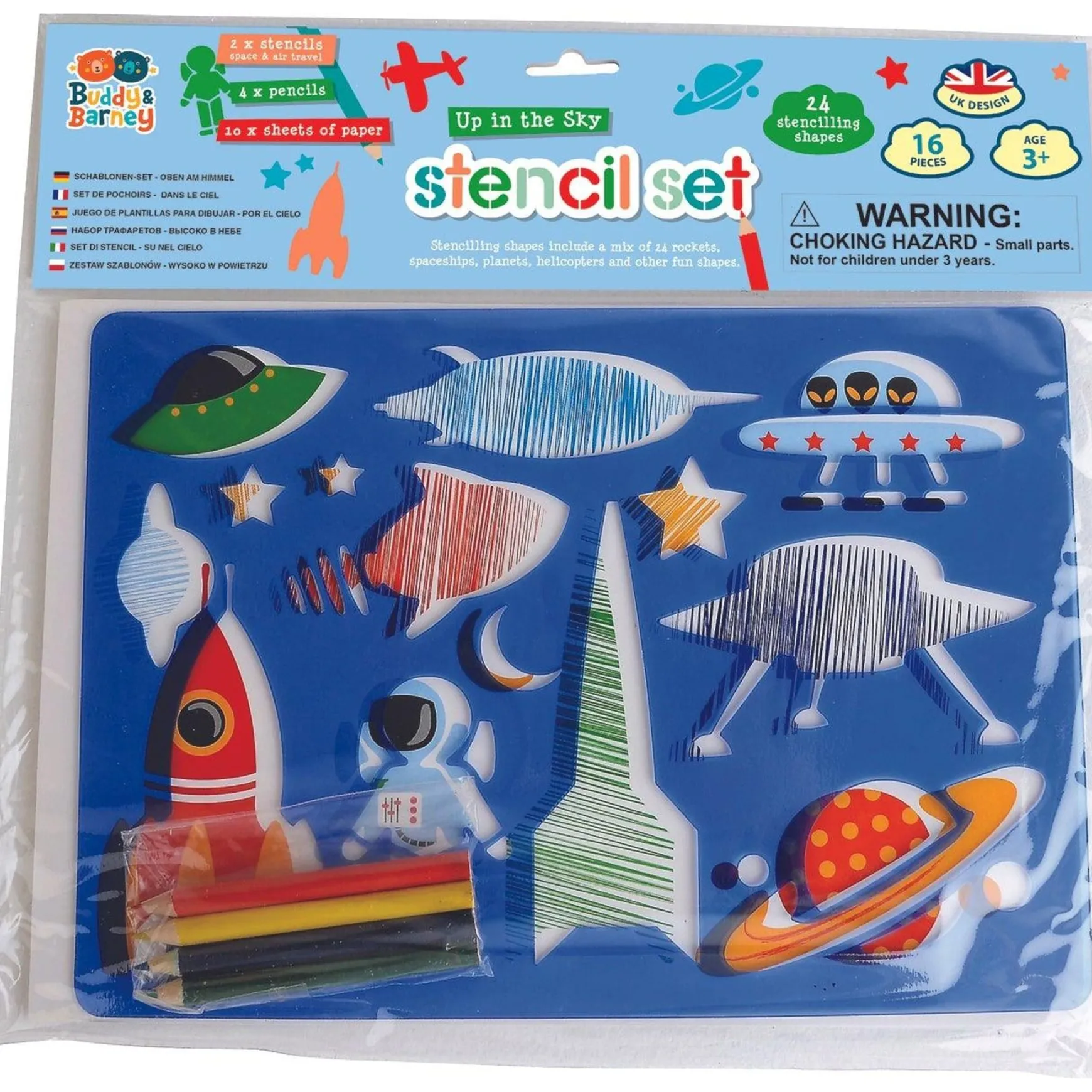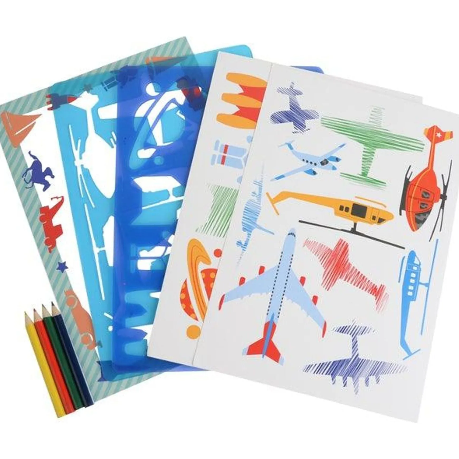 A double pack of sturdy stencils with 4 colouring pencils and 10 sheets of patterned paper.