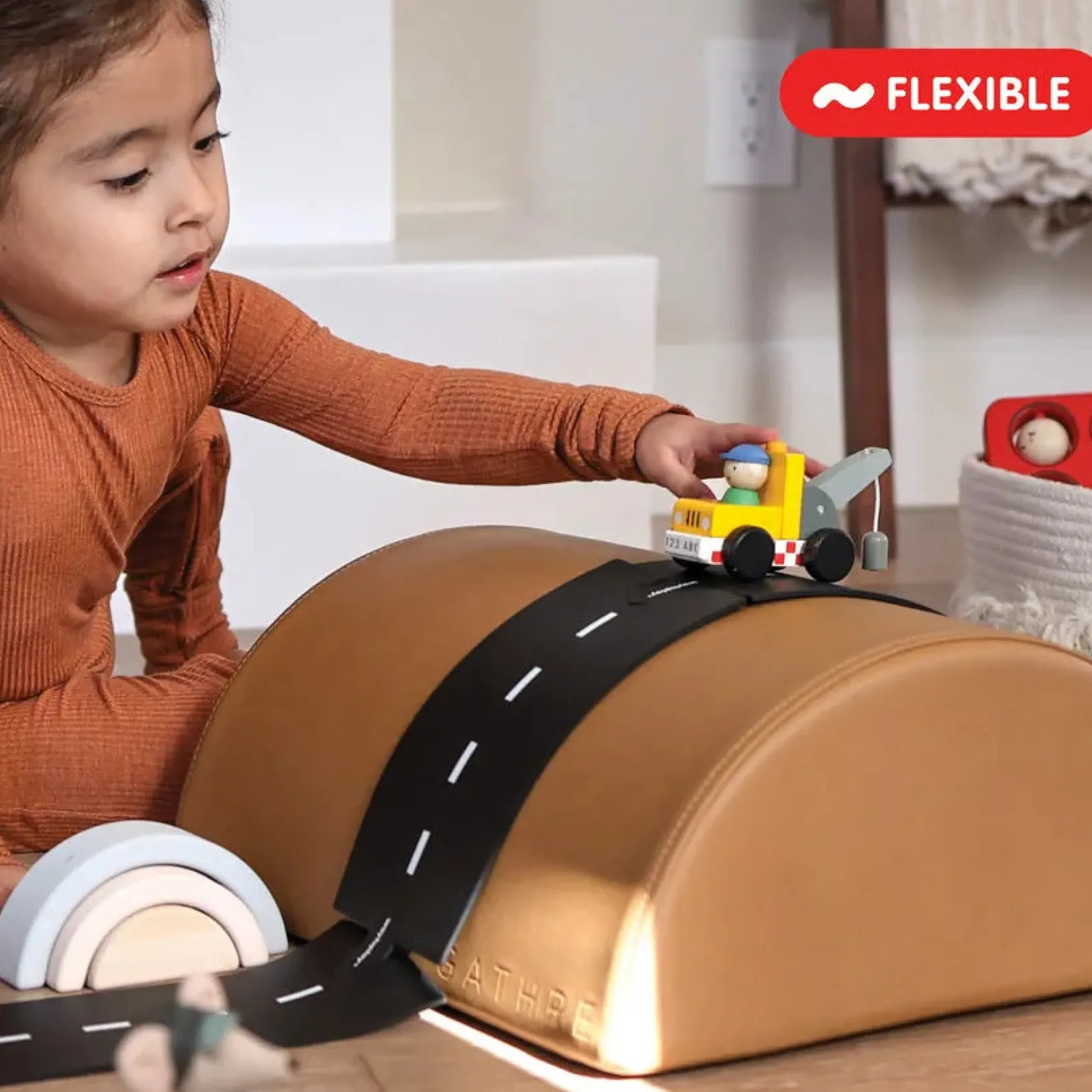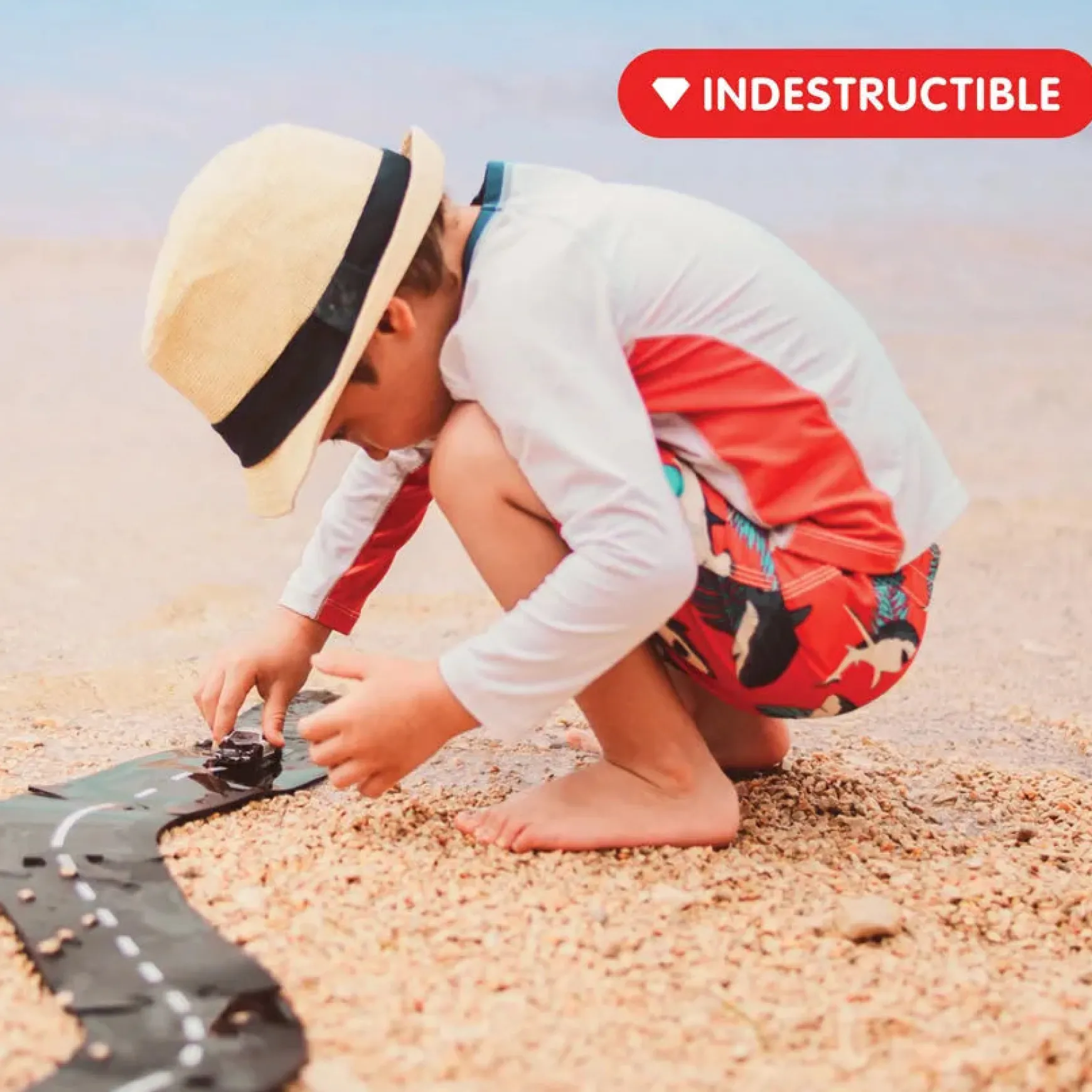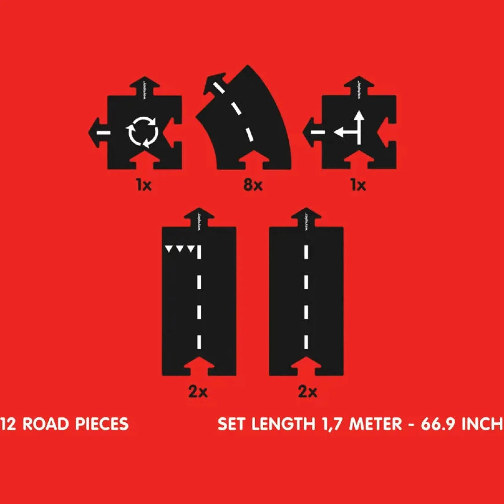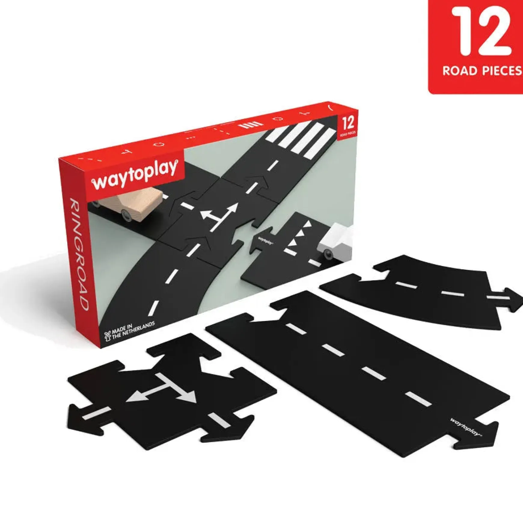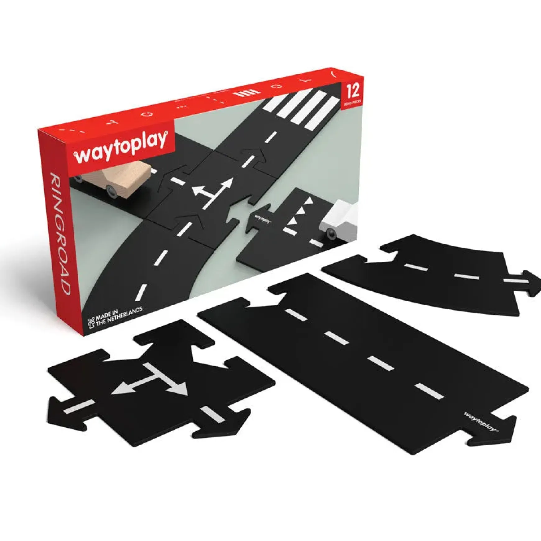 The waytoplay Ringroad car track is a flexible beginner set for younger children. Create various road layouts with 12 pieces. Encourage imaginative open ended play and combine with other toys in your toy box to create a real personal play scene. Tactile and easy to assemble little hands will delight in creating different tracks. Durable for both indoor and outdoor play this range is able to be used on practically any surface and in any weather conditions. Waterproof and easy wipe clean play at the beach in the bath or in the garden. Can also be used to expand your other waytoplay tracks. Waytoplay is a premium road track system which is printed on both sides to ensure the optimum level of play variations are truly available. Includes all road shapes; 8 curves 2 straights 1 intersection and 1 roundabout. Track width 11cm.