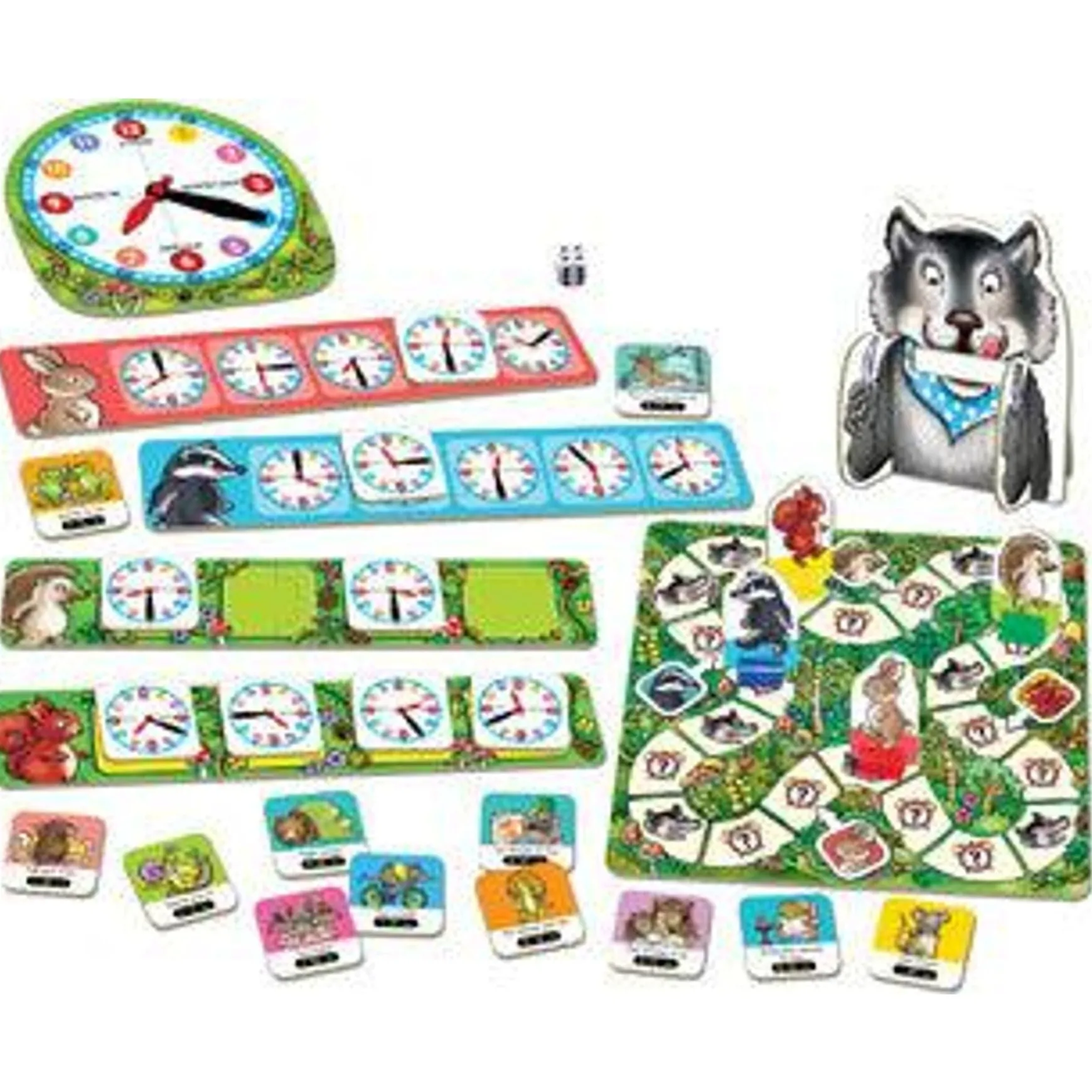Contents: 1 x jigged forest playing board, 20 x double sided square cards, 4 x jigged double sided collection boards, 1 x large clock face, 1 x set of movable clock hands, 1 x slot-together 3D wolf, 1 x dice, 4 x animal character playing pieces, 4 x character stands, 1 x instruction leaflet