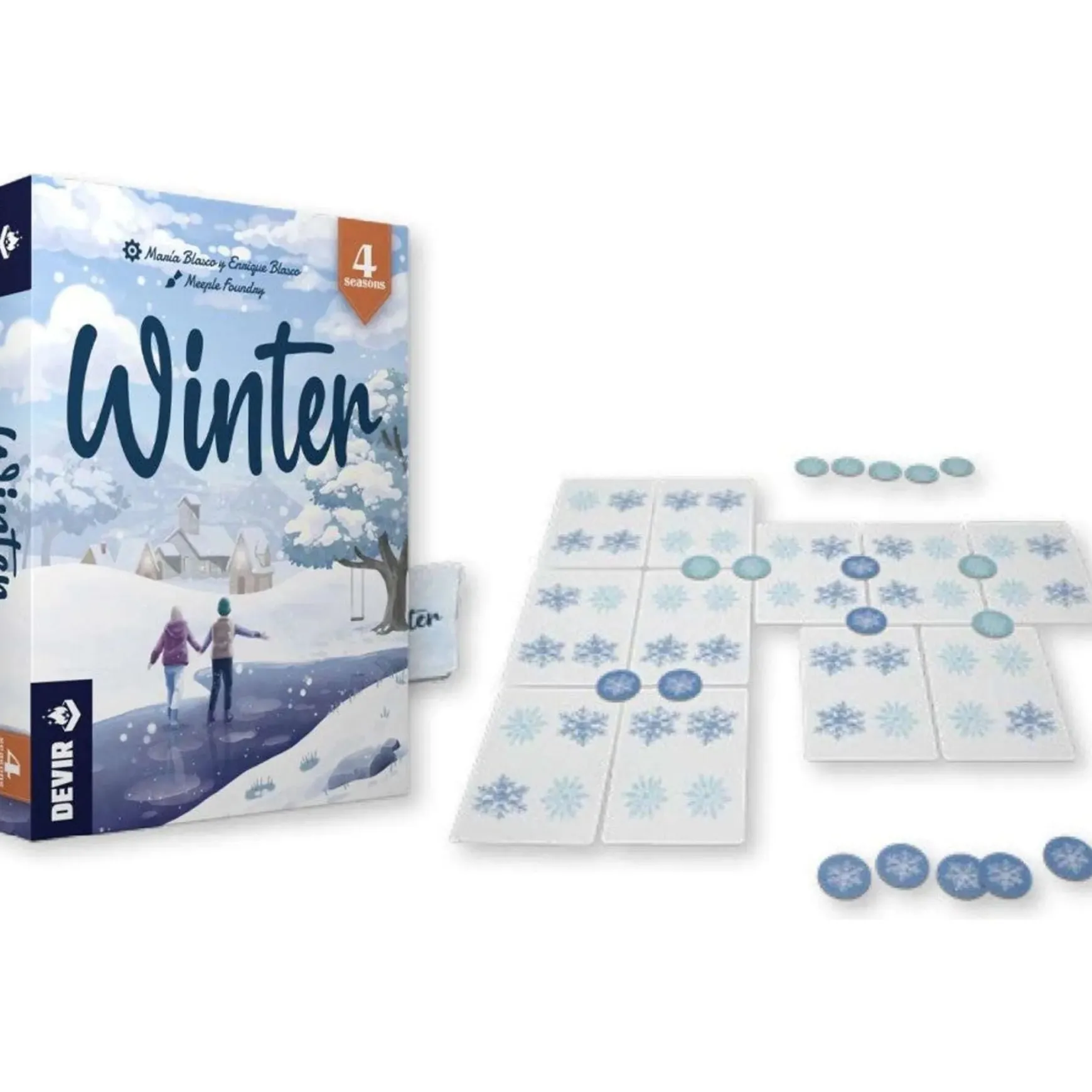 Winter has arrived, and with it the battle for control of the frozen lake. Winter is and abstract game for 2 players ages 8 and up. Games last an intense 10 minutes where good decisions are everything. Winter is part of the Devir Pockets line , small format games with simple rules that offer thousands of matches , ideal to play anywhere. Winter is the first in a new line Pocket Seasons , small games that take place in the 4 seasons of the year. Pattern construction, Area majority, Modular board.
